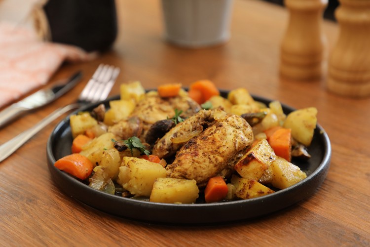 3. تبلي الدجاج والخضار بزيت الزيتون، والبابريكا، وبهارات الدجاج، والكركم، والهيل، والفلفل الأسود، والملح.