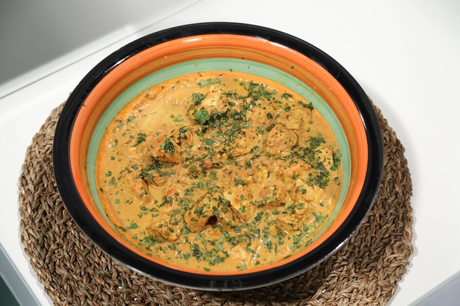 يقدم الطبق مع الرز البسمتي مزينا بالكزبرة الخضراء