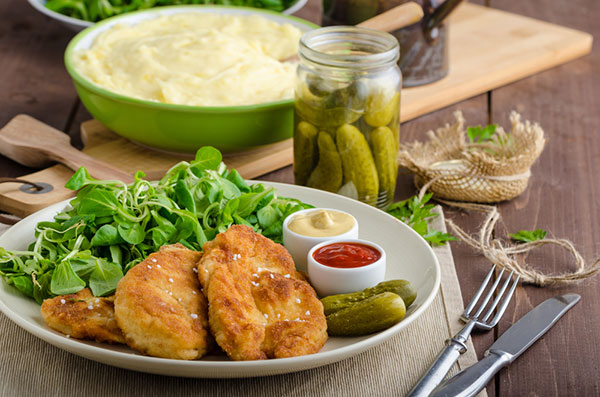 2. يمزج الحليب المبخر والخردل في وعاء غير عميق. وفتات الخبز والجبن في وعاء منفصل آخر. يغمس الدجاج في خليط الحليب، مع غمر كلا الجانبين، ثم في خليط فتات الخبز. ويوضع في الطبق.