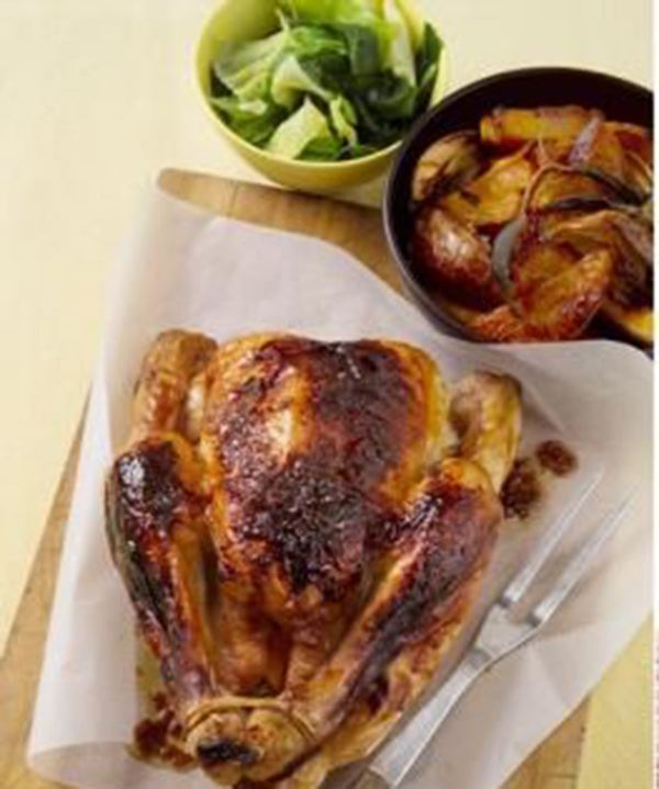 6. يُرفع الدجاج من الفرن، ويوضع جانباً لمدّة 10 دقائق. ثمّ يُضاف القرع الأصفر والبصل في طبق التقديم، ويُسكب عصير البرتقال.