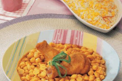 - يُضاف الحمص المقسوم والمجفف والماء ومكعبا مرقة الدجاج ماجي ويُغلى المزيج ثم تُخفّف النار. تُغطّى المكوّنات وتُترك على النار لمدّة 45 دقيقة أو حتى ينضج الدجاج والحمص. ممكن اضافة المزيد من الماء ان احتاج الأمر.