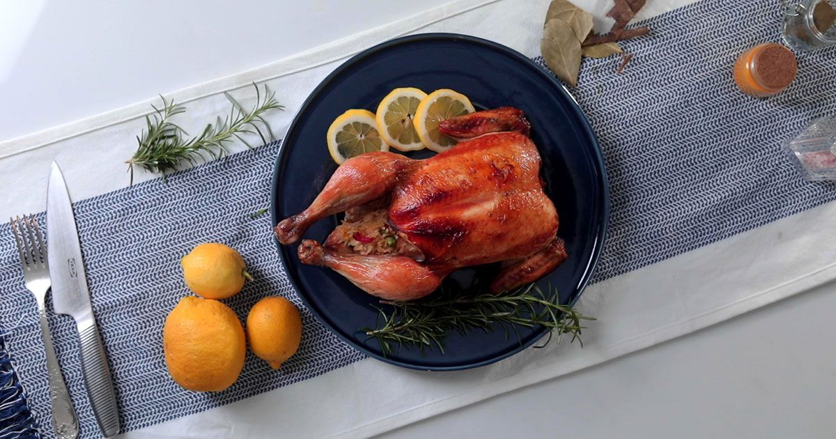 5- إحشي الدجاجة بمزيج الارز واربطي الساقين باحكام.