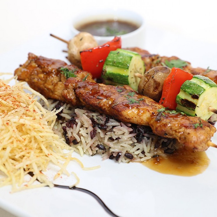 4. تشوى أشياش الدجاج والخضراوات على الـ”جريل”، بعد دهنها بصلصة الصويا الحلوة، باستخدام فرشاة الطعام.