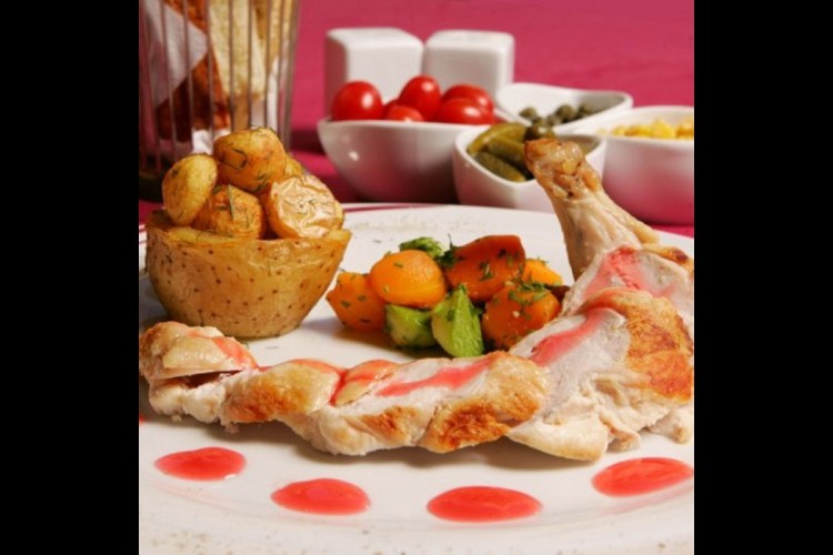 6. في طبق التقديم، يوزّع الدجاج، والى جانبه الخضر المسلوقة والبطاطا المشوية والمحشوّة بمكعبات من البطاطا المقلية. ويزّين بالبقدونس المفروم وبعصير التوت البرّي، ويقدّم ساخناً.