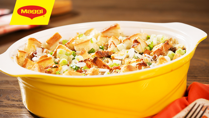 - 20 قطعة من شرائح خبز التوست، مقطعاً إلى مكعبات