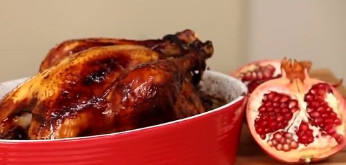 دجاج مشوي بدبس الرمان طبق شهي جدا، ورائع من الدجاج المحشو بالفريكة والاجاص المجفف، الجوز، القرفة ومكعب مرقة الدجاج، يقدم دجاج مشوي بدبس الرمان بعد خبزه بالفرن الى جانب الحشوة والمرقة أو مع طبق من سلطة الخيار ولبن الزبادي أو سلطة الخضار.