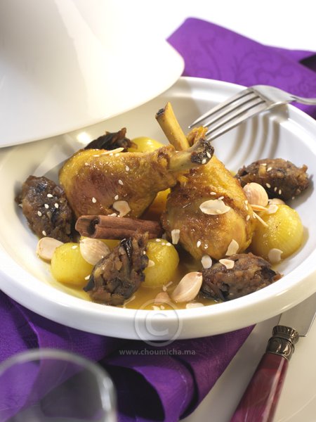- عند التقديم تصفف افخاذ الدجاج، تزين بالبصل الصغير وبمربى البادنجان واللوز.