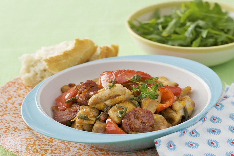 2. تُضاف ملعقة من زيت الزيتون إلى مُقلاة كبيرة الحجم، وحين يسخن الزيت (من دون أن يحترق)، تُقلَّب قطع الدجاج في المقلاة، حتَّى تُصبح بنيَّة اللون، أي لحوالي خمس دقائق. ثمَّ، تُرتَّب في جانب من المقلاة، ويُضاف الزيت الباقي إلى الجزء الآخر من المقلاة. ويُقلَّب فيه كلٌّ من الفيلفلة والثوم والسجق والمريميَّة. ويُنثر الزعتر. وتبقى المُكوِّنات على النار، لبضع دقائق.