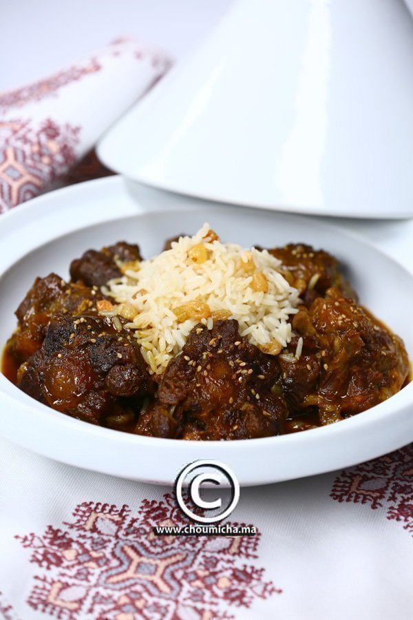 - في طاجين مسخن، تصفف قطع اللحم، تزين بالأرز بالعنب المجفف، تسقى بالمرق وترش ببذور السمسم.