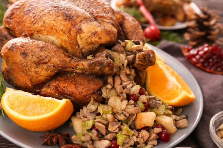 6. افركي الديك الرومي بالثوم البودرة والبهارات المشكلة وعصير البرتقال وبشر البرتقال من الداخل والخارج.
