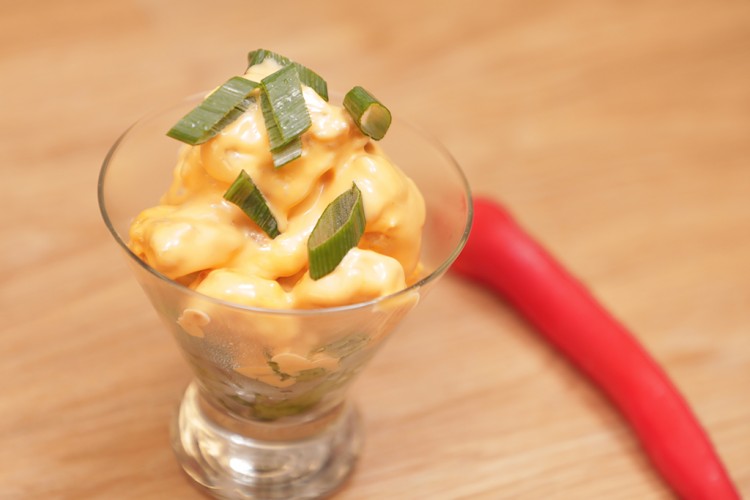 6. غطسي حبات الروبيان المقلية بخليط المايونيز.