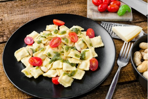 - الآن وفي طبق تقديم، القليل من الرافيولي مع أنصاف الطماطم الكرزية والقليل من تتبيلة الريحان التي قمنا بتحضيرها وأصبح طبقنا جاهزاً.