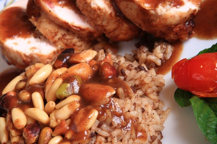 5. يُسكب الأرز في طبق التقديم، ويُزيّن بالمكسّرات المقليّة (لوز، صنوبر، فستق حلبيّ وكاجو)، وإلى جانبه الدجاج والصلصة.