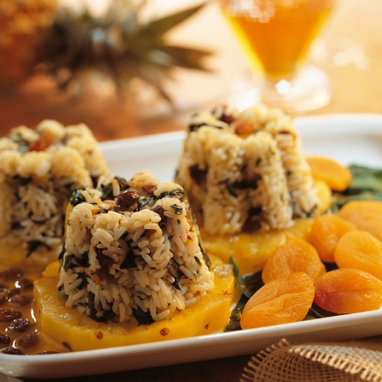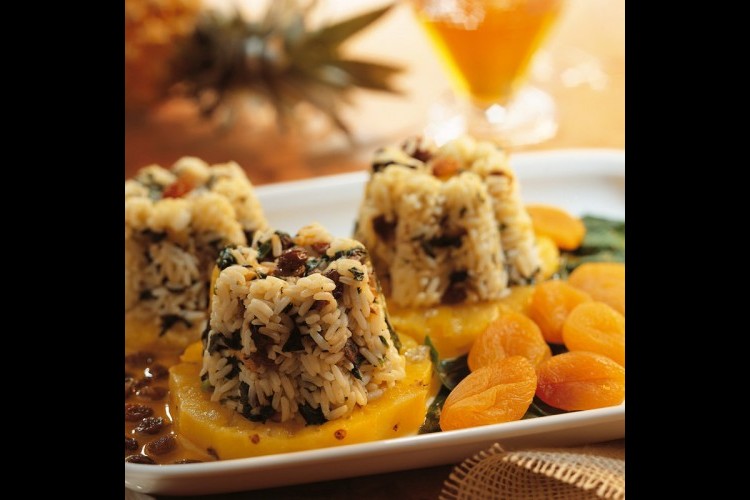 3- يقلّب الأرز ويوضع على نار هادئة لمدة 10 دقائق، ثم يرشّ الزعفران على الوجه، ليوزّع بعدها المشمش والتين والأناناس فوق الأرز، مع التقليب.