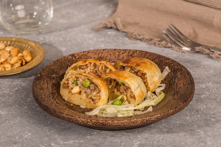 4. لتجهيز العجين: يُفرد كلُّ مربَّع من عجينة الـ”بف بيستري” في طبق دائري، ويُضاف مقدار 3 ملاعق كبيرة من حشو الأرز إليه، ثم تُقفل العجينة من أطرافها جيِّدًا وتكوَّر قليلًا، ثمَّ تُنقل إلى صينيَّة الخبز. تُكرَّر العمليَّة، حتَّى تنفذ مُربَّعات العجين. وتُدهن كلُّ صرَّة بخليط مُعدٍّ من صفار البيض والكريما المخفوقين جيِّدًا.