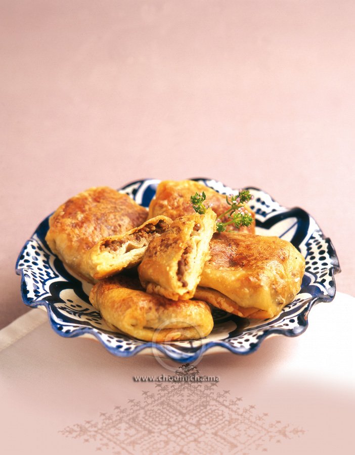 في مقلاة، يسخن الزيت ويحمر فيه البصل حتى يصبح شفافا. يضاف اللحم المفروم والتوابل، يترك الكل ينضج ما بين 5 إلى 8 دقائق مع التحريك من حين لآخر. تزال الحشوة من فوق النار ويضاف إليها القزبر والبقدونس ثم تترك تبرد.