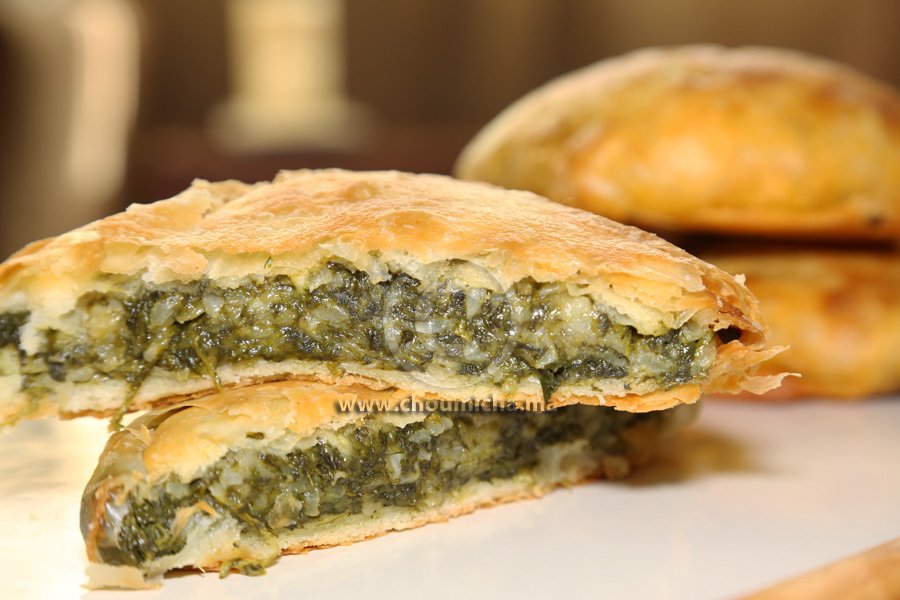 - يوضع مربع العجين المحشو : الرغيفة فوق صفيحة ملبسة بورق المطبخ. تعاد نفس العملية للحصول على 4 رغيفات مورقة محشوة. تدهن الرغايف بالزيت وتطهى في المفرن المسخن على درجة الحرارة 190 لمدة 30 إلى 40 دقيقة.