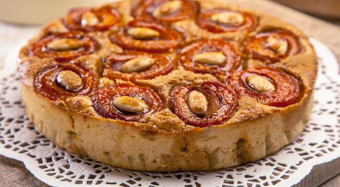 يوزع المشمش بشكل متساوبحيث يكون السطح المقسوم للاعلى ويوضع حبة لوز في المنتصف.