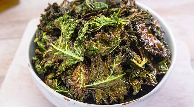تشرّب أوراق الكال بزيت الزيتون وترش بالملح البحري.