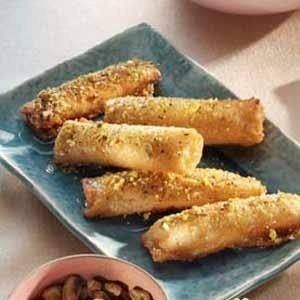 2. نضع قليلاً من الحشوة على الرقاقة ونلف كل رقاقة على شكل إصبع رفيع ونصفها