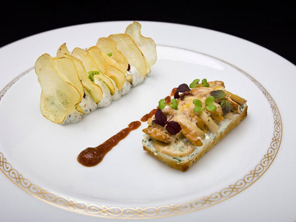 5. طريقة التقديم: يقطّع “التوست” إلى 4 مستطيلات، ويحمّص جيّداً. ثمّ تُدهن قطع التوست بكريما الأعشاب ويوضع عليها الفطر المحمّر وتنثر “البارميزان”. ثمّ يتمّ إدخالها إلى الفرن للتحمير. تصفّ شرائح البطاطس فوق الكريما بالأعشاب، كما هو واضح في الصورة، يجاورها مربّى البندورة.