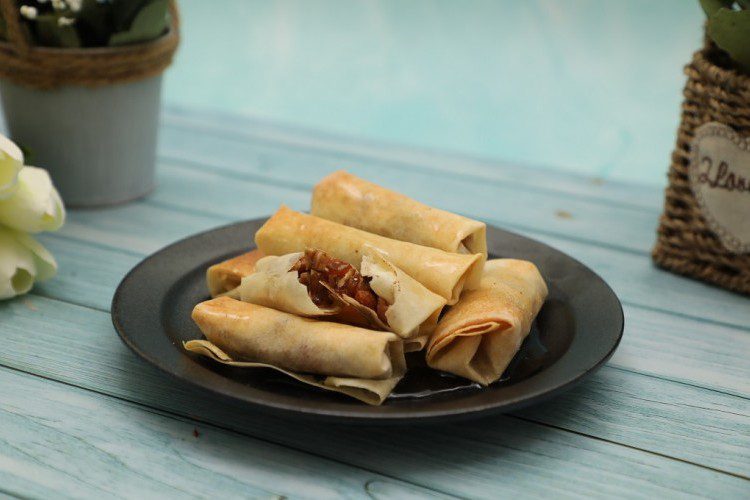 - افردي عجينة السبرينغ رول على السطح المراد العمل عليه، ووزعي مكونات الحشوة في العجينة ولفيها على شكل رول وأغلقي أطرافها بمزيج اللصق وضعيها في صينية مبطنة بورق الزبدة.