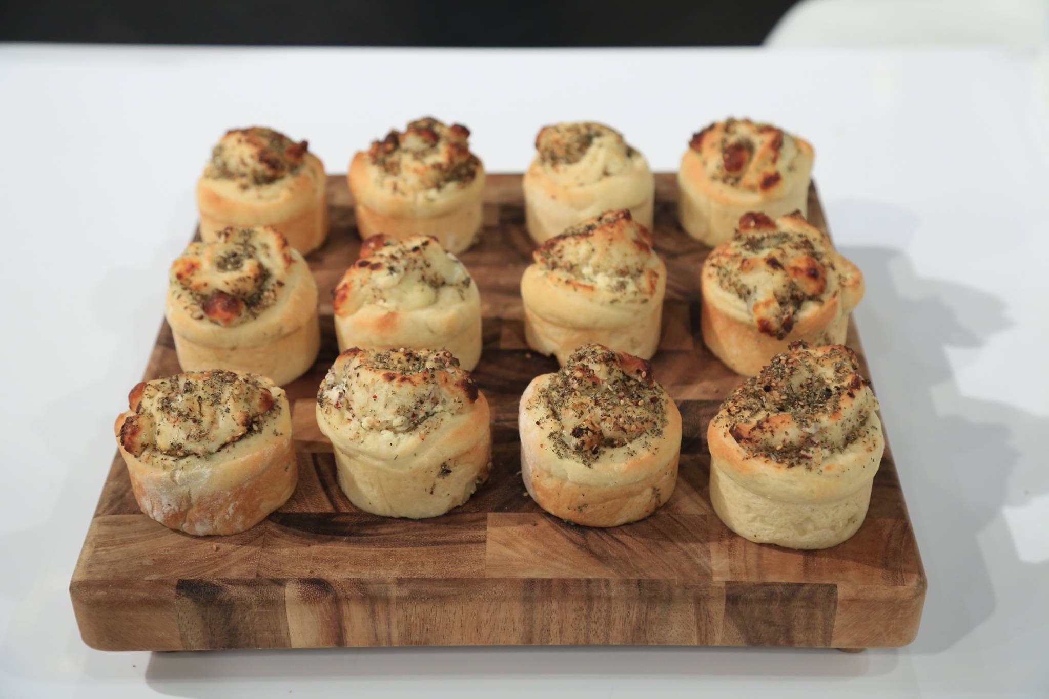 ادهنيها بجبنة الفيلادلفيا وترشيها بالزعتر ثم وزعي الجبنة البيضاء ولفيها على شكل رول مثل السينامون رولز وقطعيها. ضعيها في قوالب الكب كيك ويفضل أن تكون من السيليكون