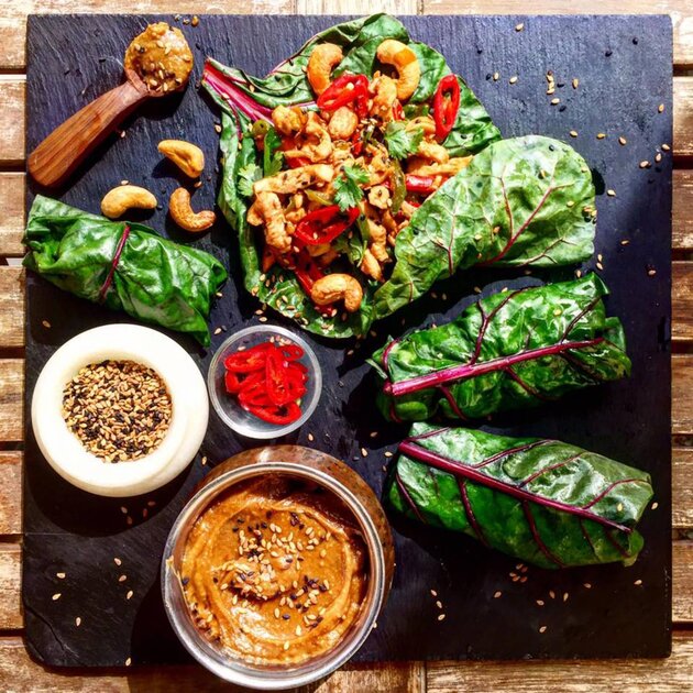 لعمل الرولز نفرد قطعة من الكايل أو السلق و نضع جزء من الخليط على طرف الورقة و نلفها مثل ورق العنب أو الكرنب المحشي