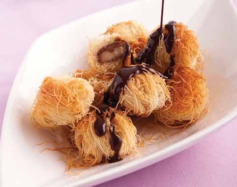 - قطعي أصابع بسكويت الشيكولاته إلى قطع ولفي القطع مع العثملية إلى كرات وضعي فوقها الزيت والزبد .