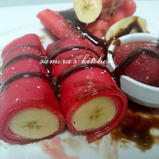 - يمكنك دهن أحد أوجه الكريب بالشيكولاتة وتطبيقه كالمنديل وتزيين سطحه بالشيكولاتة وقطع الموز ، ثم يقدم .