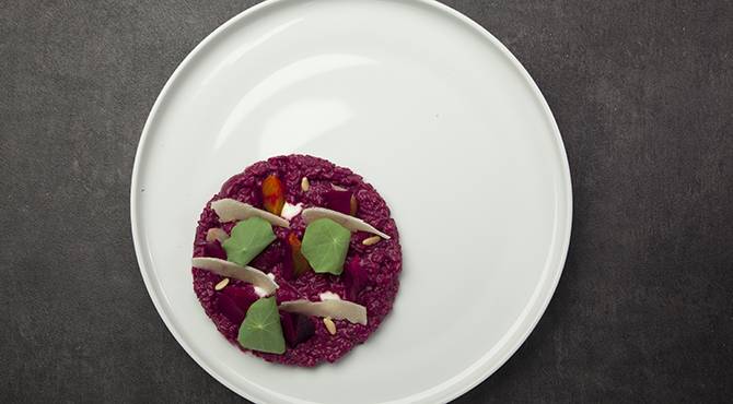 تزين الريزوتو بالشمندر المشوي وهريس البصل والبارميزان المبشور ومخلل الشمندر وأوراق الشمندر الطازجة والبقدونس المصغر.