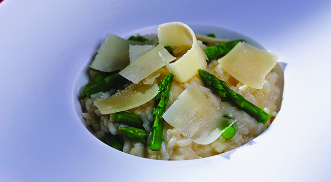 تُضاف سوق الهليون الخضراء المقطعة إلى أطوال 1 بوصة إلى الأرز ويتم البدء في إضافة المرق في صورة ملء مغرفة كاملة في المرة حتى يصبح الأرز جامدًا ولكن غير صلب.