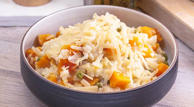 يوضع قرع العسل المقطع مكعبات والبصل والبازلاء والأرز في طبق كاسرولة كبير مقاوم للحرارة مع غطاء ، يضاف المرق مع التحريك وتنثر الزبدة المقطعة على خليط القرع والأرز.