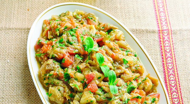 يُضاف الباذنجان المقطع والبقدونس والكزبرة ويُتبل الخليط بالملح والفلفل حسب الرغبة.