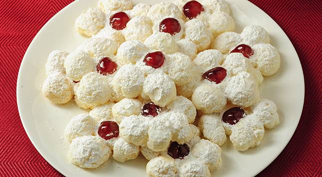 توضع نصف حبة من كرز مسكر في وسط كل زهرة.