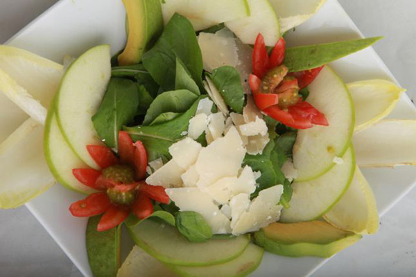 5. طريقة التقديم: توزع في دائرة طبق التقديم أوراق الأنديف التي لم تستخدم، وفي الوسط يوضع الخس المقطّع، والأفوكادو في الأعلى والتفّاح على الأطراف.ويزيّن بالبندورة وأوراق الحبق الخضراء والجبن.