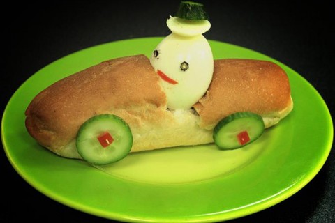 - تقطع شرائح خيار وتوضع علي حافة العيش علي هيئة عجلة ( الساندوتش علي هيئة عربية والبيض علي هيئة انسان)