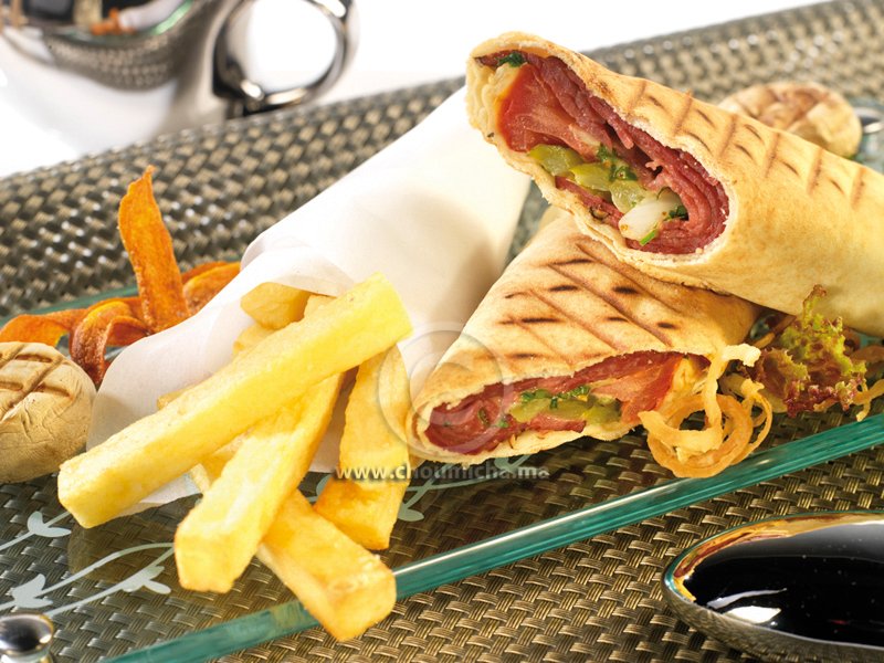 - يحشى الخبز العربي بثلاث شرائح بسطرمة، الطماطم، الخيار المخلل والبصل. يلف الخبز العربي ويحمص في آلة البانيني.