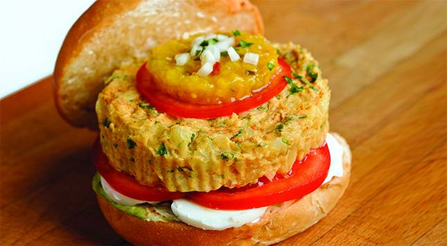 يُفتح الرغيف ويُفرد المايونيز على الجانبين من الداخل، ثم يوضع الخس وشرائح الطماطم على النصف السفلي من الرغيف، ثم تُغرف سلطة البطاطس فوق الطماطم وتُفرد برفق نحو حواف الرغيف، ثم يوضع الجزء العلوي ليُغلق الرغيف على السلطة.