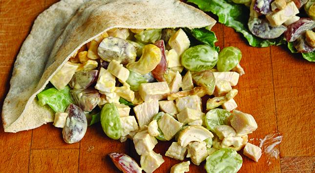 لتجميع الساندويتشات، يُقطع كل رغيف من خبز البيتا إلى نصفين وتوضع ورقتان من الخس في كل نصف، ثم تُغرف سلطة الدجاج، وتُقدم الساندويتشات.