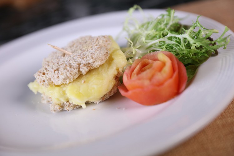 4. توضع هذه القطعة بين قطعتين من التوست الأسمر، وتزين حسب الرغبة.