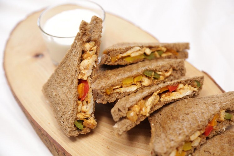 3. للتقديم: ضعي كمية من خليط الدجاج فوق شريحة من التوست، وغطي بشريحة أخرى.