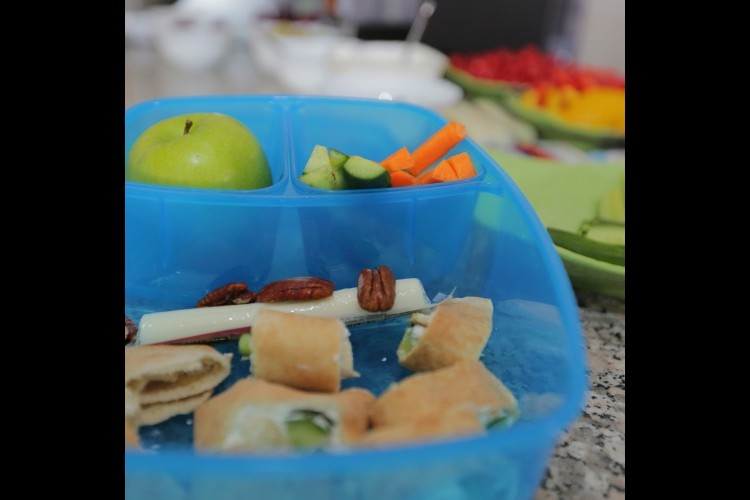3. لفي الرغيف بالشكل الأسطواني، ثم قطعيه لقطع صغيرة، وضعيهم في اللانش بوكس، مع إضافة حبة من التفاح، وشرائح مغسولة ومقطعة من الخيار، والجزر، وقطعة من الجبنة المفضلة لطفلك، وإضافة حبات من الجوز.