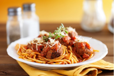 - في طبق تقديم، القليل من السباغيتي و فوقها القليل من بضعة كرات من اللحم و القليل من الصلصة والقليل من جبنة البارميزان ويصبح طبقنا جاهزاً.