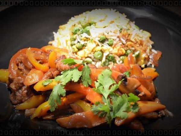 3- لإعداد الخضر: يسكب في مقلاة الطعام اليابانية wok زيت الزيتون لقلي البصل الأحمر والثوم لمدة دقيقة واحدة تقريباً. ثم، يضاف الجزر المقطع إلى شرائح طويلة والفلفل الرومي الأصفر والأخضر والفطر، ويحرّك هذا المزيج جيداً.