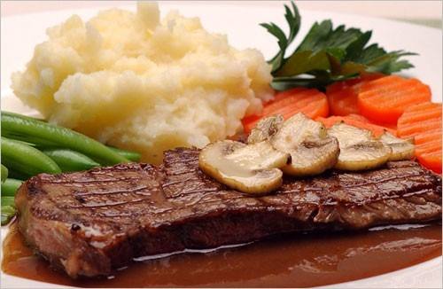 - تُوضع شرائح اللحم في طبق التقديم وتُغطى بالصلصة و تُقدم مع بيوريه البطاطس والزهرة والبروكلي المسلوق.