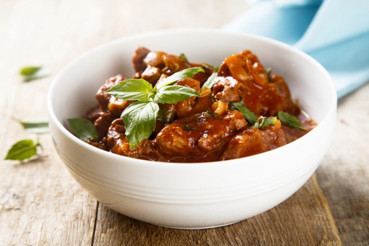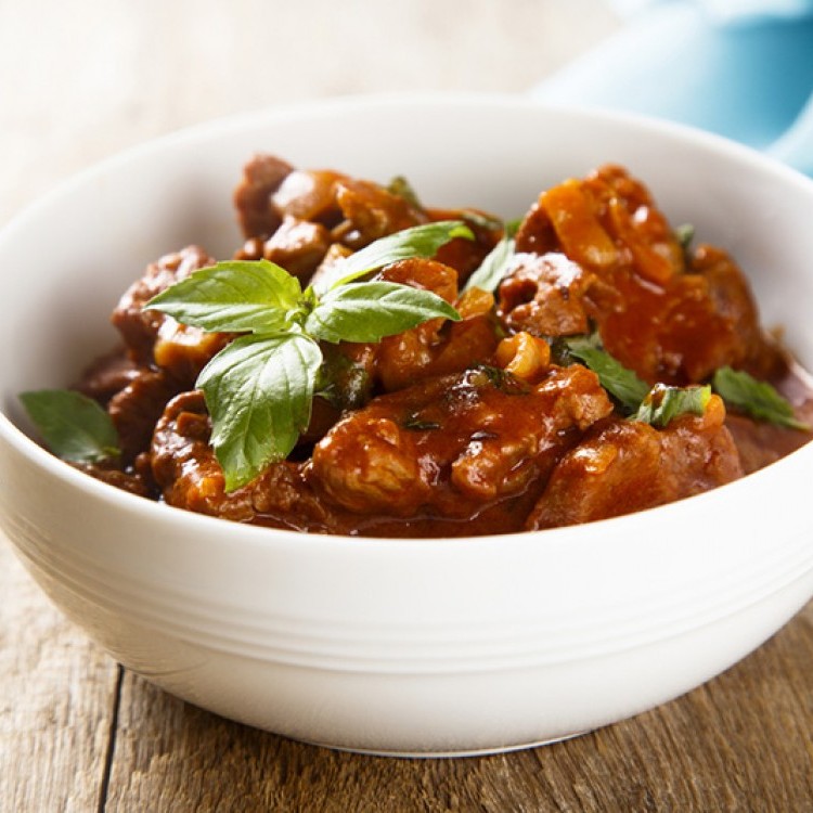 7. ضعي اللحم في طبق التقديم وصبي مزيج البندورة والكزبرة وقدميه ساخنا.