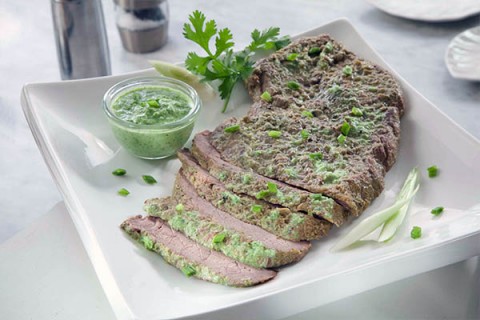 7. أنقلي الستيك على طبق للتقديم باستعمال سكين حادة قطعي الستيك الى شرائح وقدمي مع صلصة الكزبرة