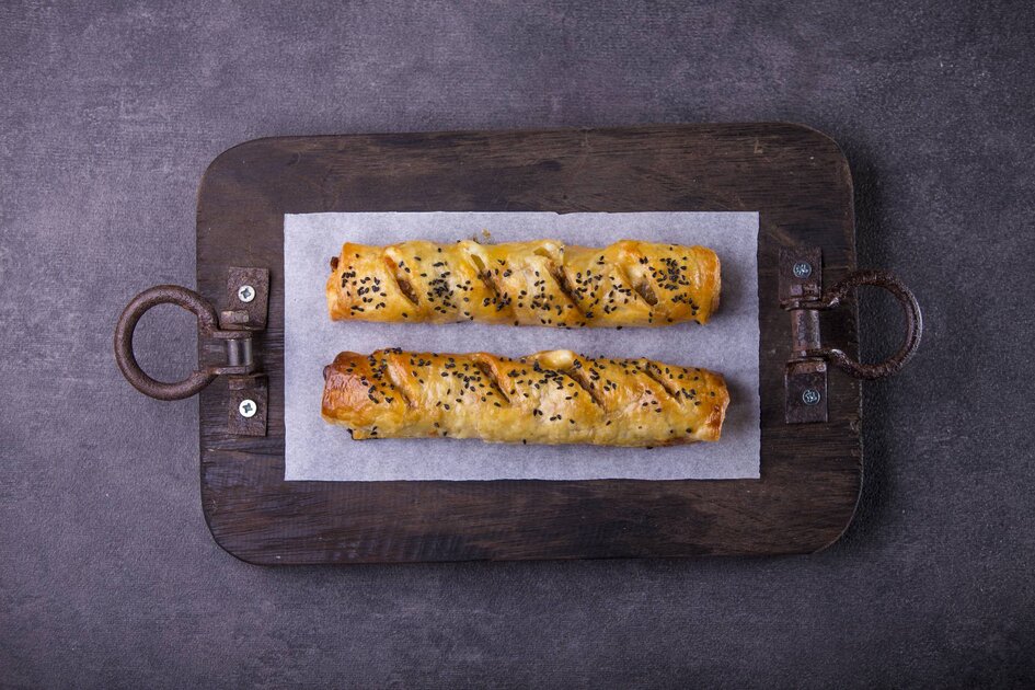 يدهن وجه لفائف السجق بصفار البيض وترش حبة البركة.