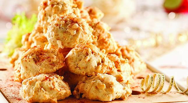 يقطع العجين إلى حلقات بقاطع كوكيز أو بسكويت قطره 1¼ بوصة مرشوش بالدقيق، ثم توضع الحلقات في الصينية المجهزة وترش بالقليل من الفلفل الحريف.
